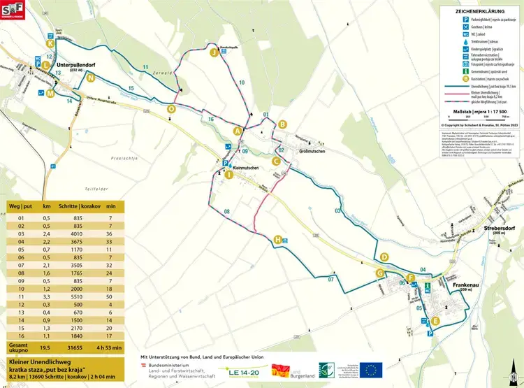 Der Unendlichweg kann zu Fuß oder per Fahrrad aus Frankenau, Großmutschen, Kleinmutschen und Unterpullendorf gestartet werden und führt zu den schönsten Plätzen unserer Gemeinde. Es besteht aus zwei verschiedenen Streckenführungen: